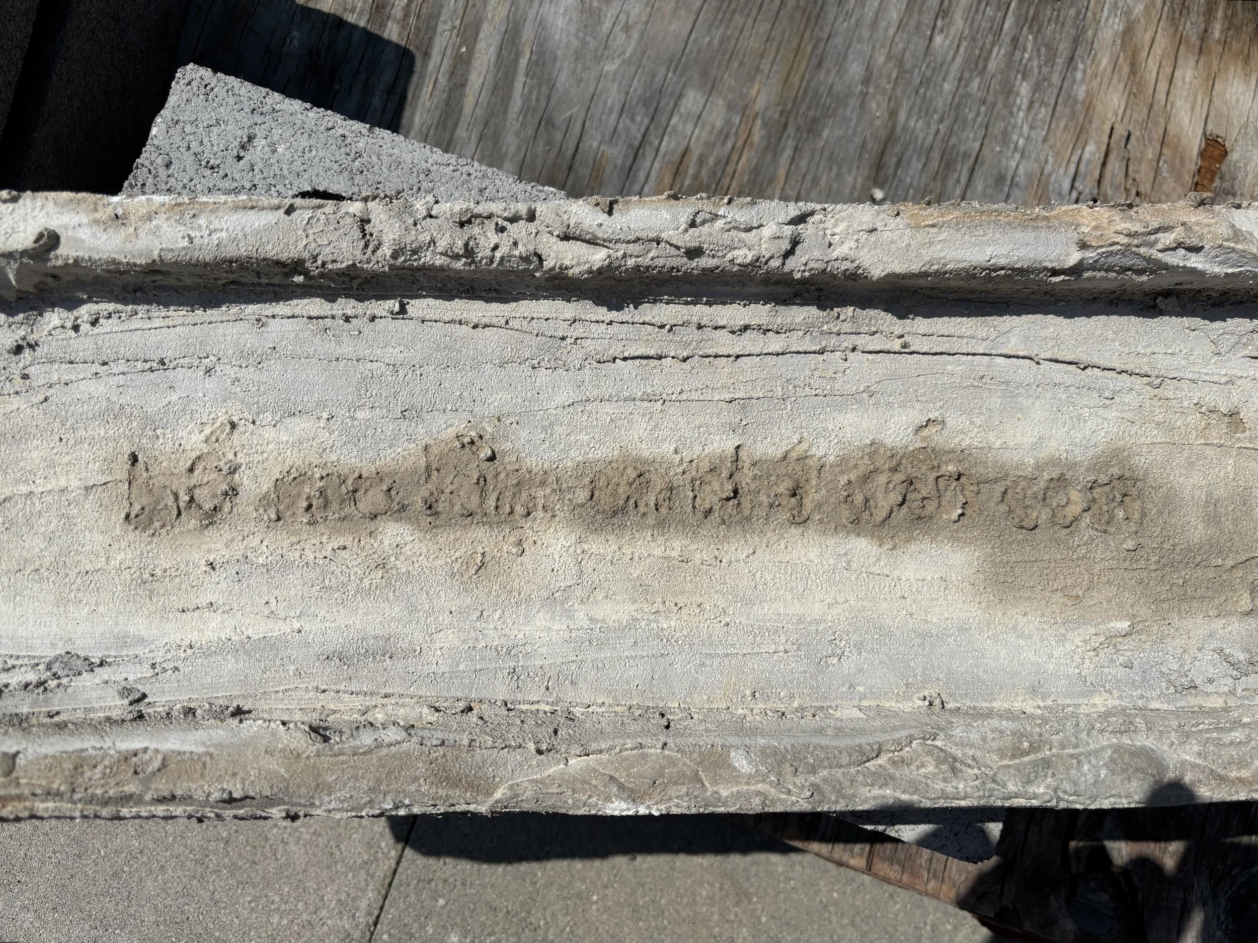 I cleaned out my concrete basin to prepare for upcoming recordings, and completely forgot that I had carved into the basin. So, underneath where the clay phrase would slake, there is a permanent plea that’s covered by clay until the entire message is cleaned out.