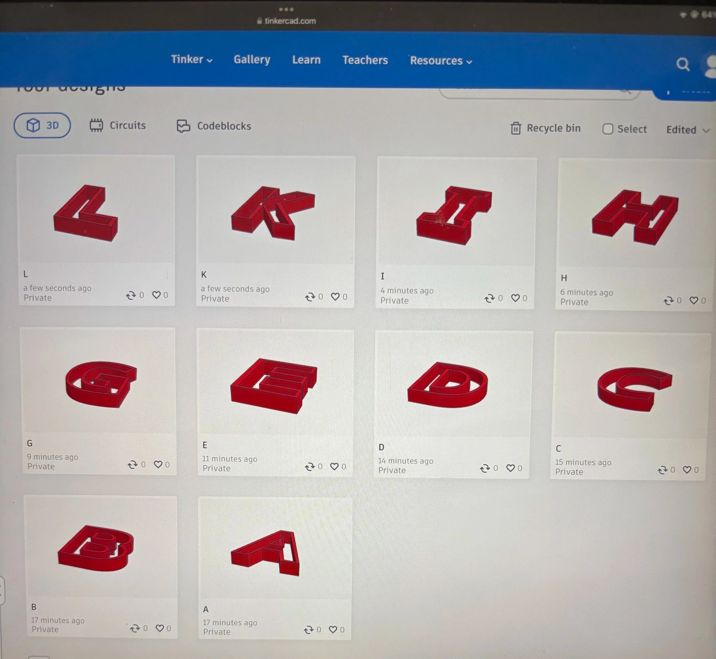 Cookiecad was a really cool software, but Tinkercad worked the best since they have a text option where I can 3D build a design based off of text. I have the walls of each letter in the Vietnamese alphabet, but before I finish the designs from just wall outlines into clay cutters, I need to fix some letters. For example, letters like V, M, and B have intersecting lines, so I cannot create the desired space needed with the hole tool. I’m not exactly sure how to fix it, but I think the issue lies within how text is coded into Tinkercad. I tried to use the already existing letters, but I could not change the bevels like the process I chose which was using the text tool, typing in a letter, setting it to 1.5 bevel, and copy pasting an identical version but adjusting to .5 bevel, hole, and slightly taller so the hole would ensure carving out the solid piece.