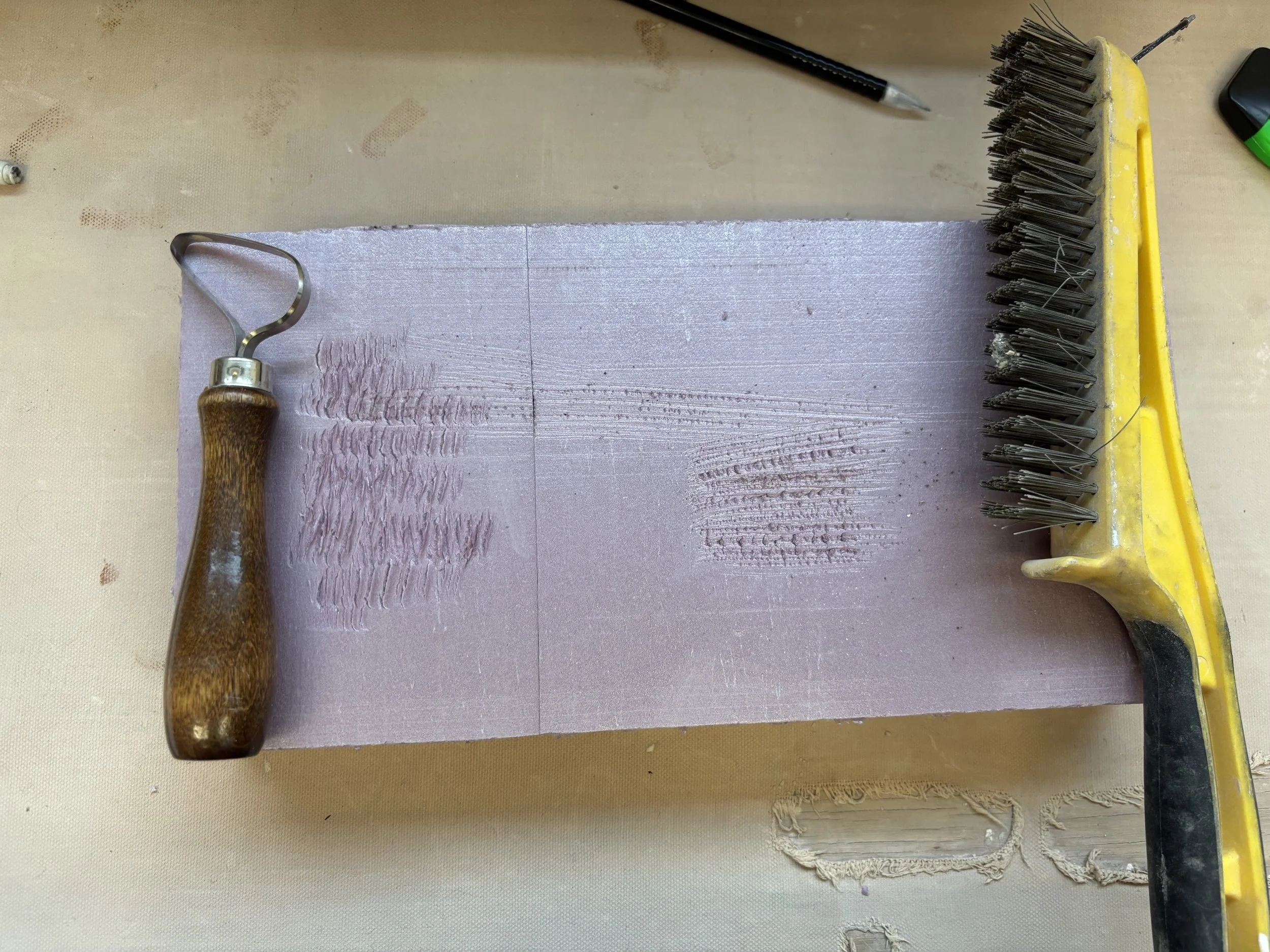 On Wednesday, I started my mockette. At first, I cut out a 1 inch thick foam board, because that is what I had most of but then I soon realized that to make a joint, it would be easier to have more material to work with so I moved onto a 2 inch thick board. Instead of adhering foam board together to create the basin/walls for slaking, I just used a trimming tool to carve out a recessed area. I’m hoping that a tongue and groove is enough. I’m a bit concerned about concrete application effecting the joinery, but I’ll have to get to that challenge next week.
