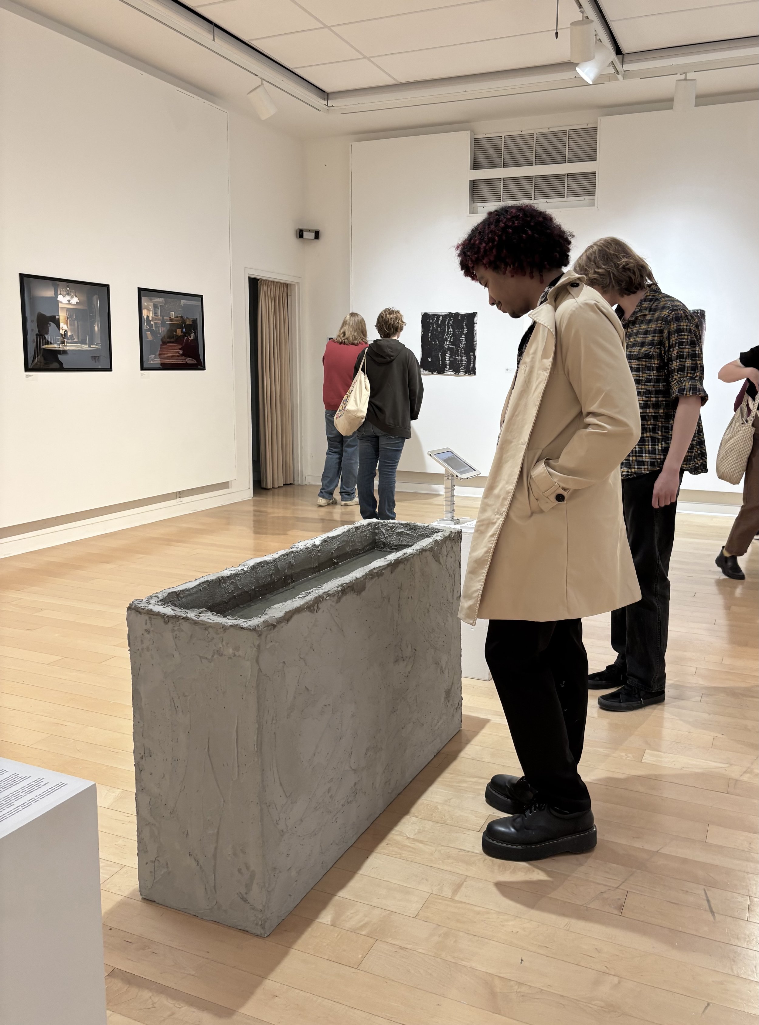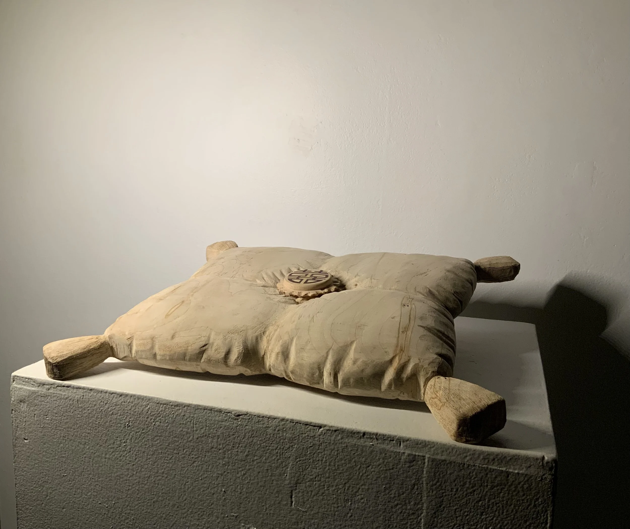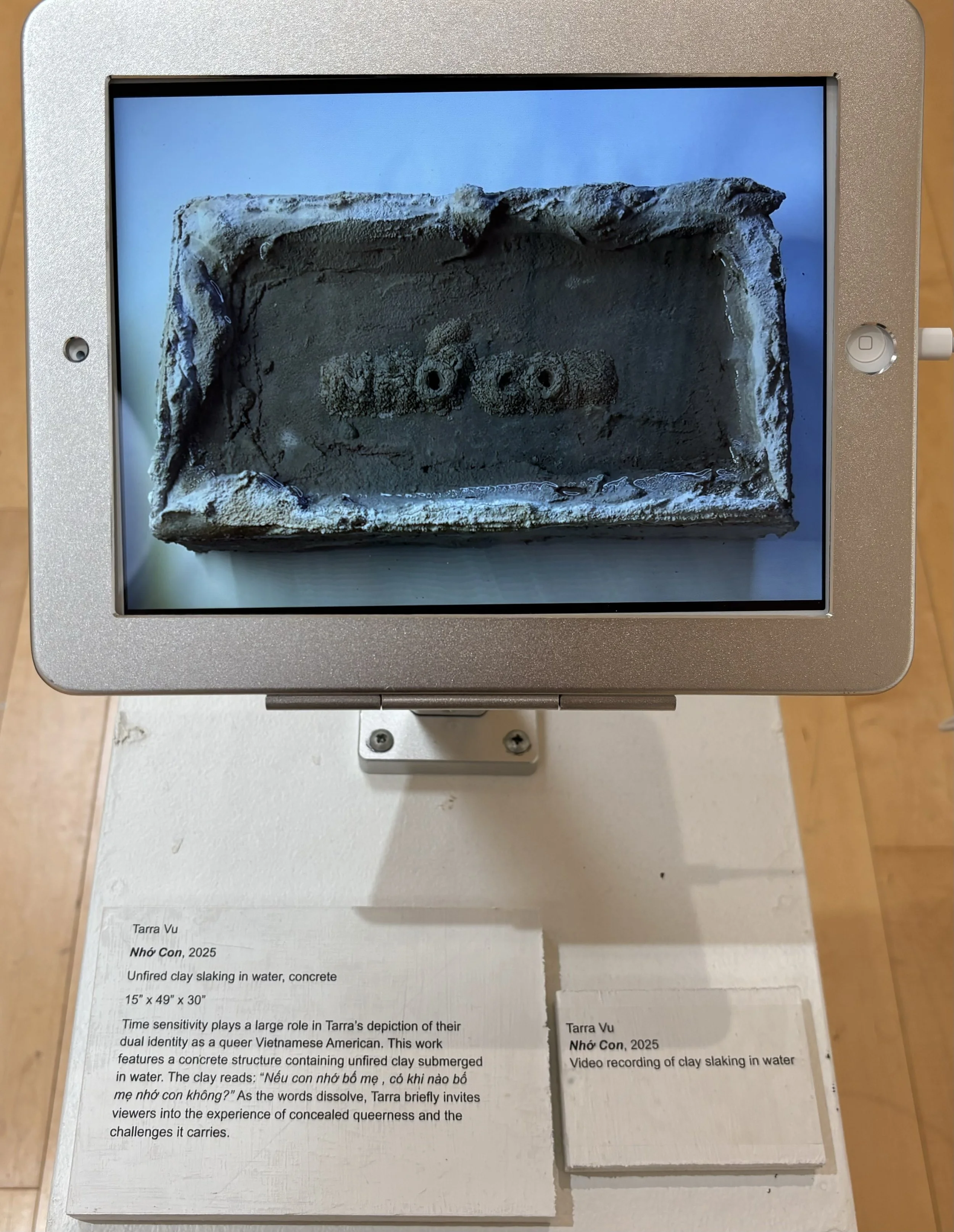 Ongoing works using concrete structures containing unfired clay submerged in water. The clay reads: “Nếu con nhớ bố mẹ , có khi nào bố mẹ nhớ con không?” Using time sensitivity, there’s a brief invitation into hidden queerness.